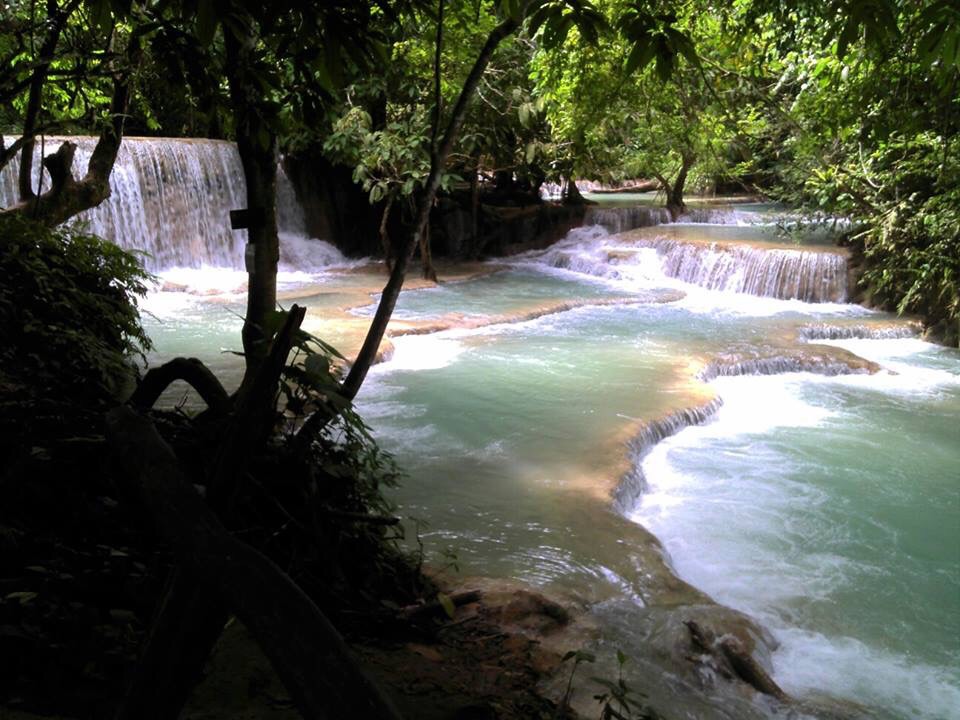 A most amazing day at Tat Kuang Si waterfalls outside Luang Prabang, Loas! it was breathtaking, unreal – something I’ve previously only seen pictures of or on TV. Huge amounts of water pouring from a mountain top and steep drop into lots of deep pools you could swim in all the way down. I walked up the path, saw some falls and thought how gorgeous it was. I was thrilled to se it, the surrounding jungle forest and them take a dip in the cold green waters of the pool I chose. rocks and roots underfoot but only went neck deep for a ‘swim’ but lots of people in there, and around including babies.